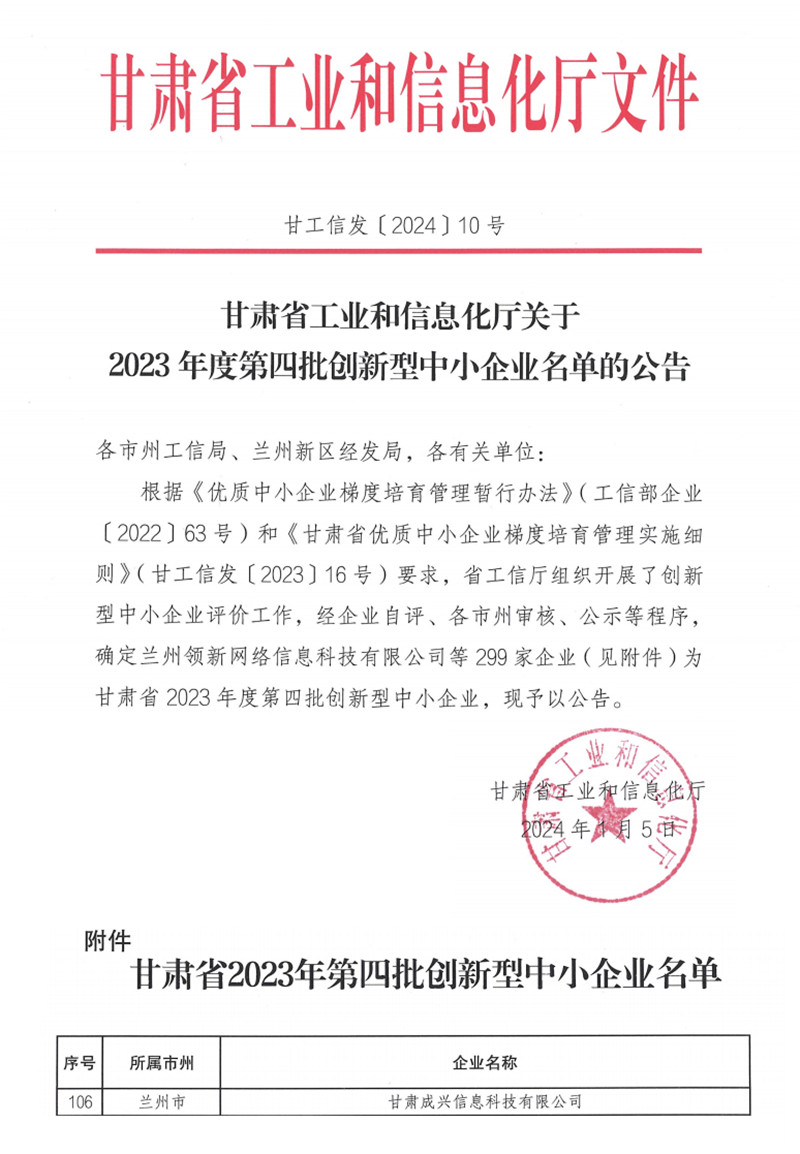 近日,甘肃省招标咨询集团全资子公司甘肃成兴信息科技有限公司,在甘肃省工信厅组织的甘肃省2023年度第四批创新型中小企业评价中获评“创新型中小企业”。