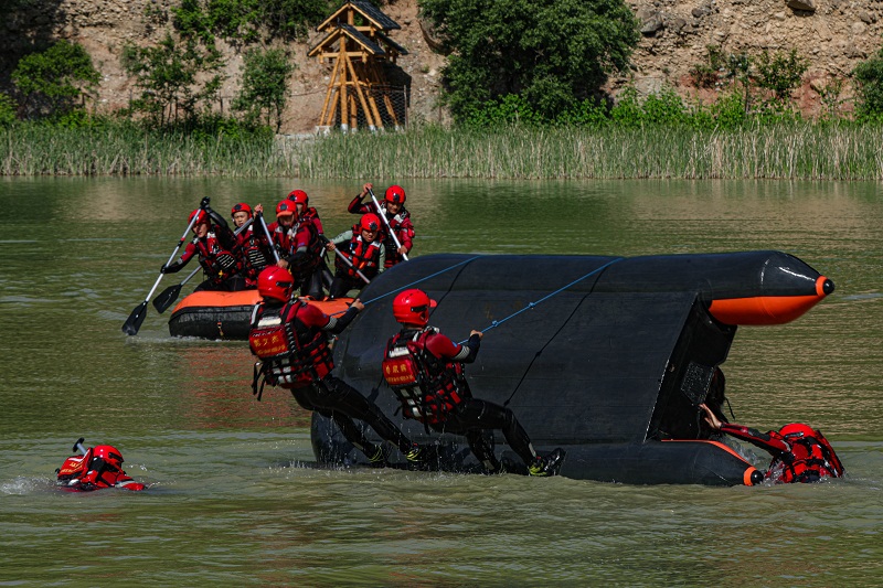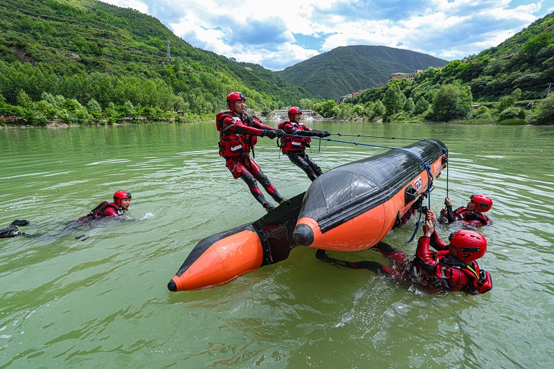 陇南地处长江流域,是滑坡、泥石流等地质灾害多发区域,同时汛期中小河流洪水和山洪内涝致灾风险高。为保证训练能够取得绝对效果,甘肃省森林消防总队陇南支队依托有利训练条件,对历次各项抗洪抢险任务进行经验复盘,根据甘肃灾害特点设置了舟艇操作、翻船自救、U型遥控救生圈等关键技术,模拟被困人员落水进行现场救援训练等科目,旨在通过实地、实装、实操,全面检验队伍在水域救援领域的训练成效。