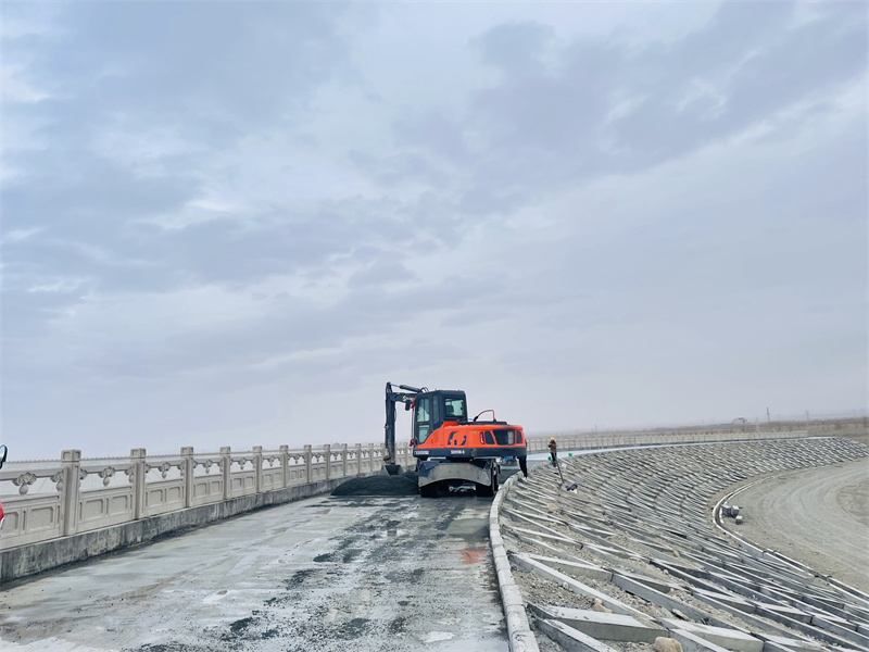 11月15日,记者在阿克塞县生态治理水系连通工程项目建设现场看到,施工车辆来回穿梭,工人正忙着进行彩色混凝土的摊铺工作。