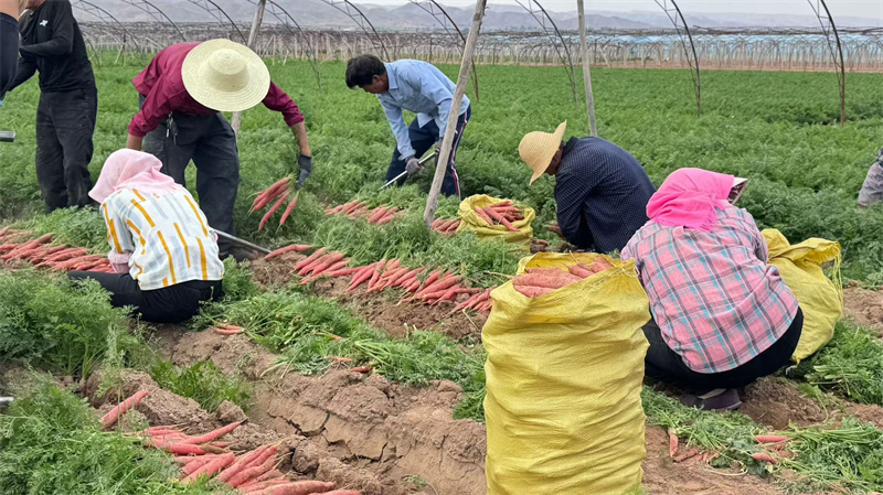 在靖远县乌兰镇红嘴村的田间地头,1500吨胡萝卜整装待发,即将奔赴各地市场。那一片片胡萝卜地里,翠绿的缨子在微风中轻轻摇曳,仿佛是大自然奏响的丰收序曲。