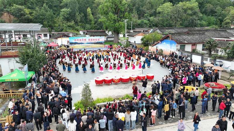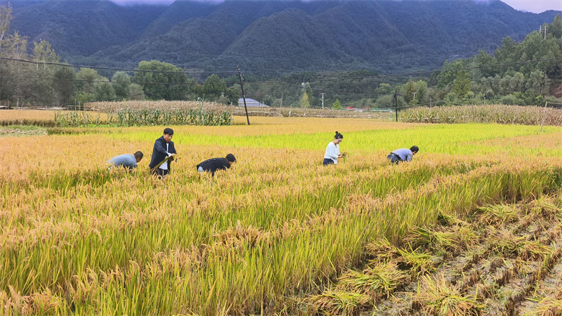在李寺村稻田旁,“庆农业丰收·享美好生活”的农民丰收节活动热闹开场。欢快鼓乐声打破田园宁静,身着民族服饰的村民手拉手跳起锅庄舞,脚步踏在田埂,笑容绽放在阳光下。随着“开镰喽!”一声吆喝,几位村民手持镰刀走进稻田,刀刃划过稻秆的“唰唰”声,与村民的吆喝声、鼓乐声交织,奏响了丰收序曲。金黄稻穗应声而落,不一会儿便堆起小稻垛,饱满稻谷在阳光下泛着光泽,映得村民脸庞格外红润。