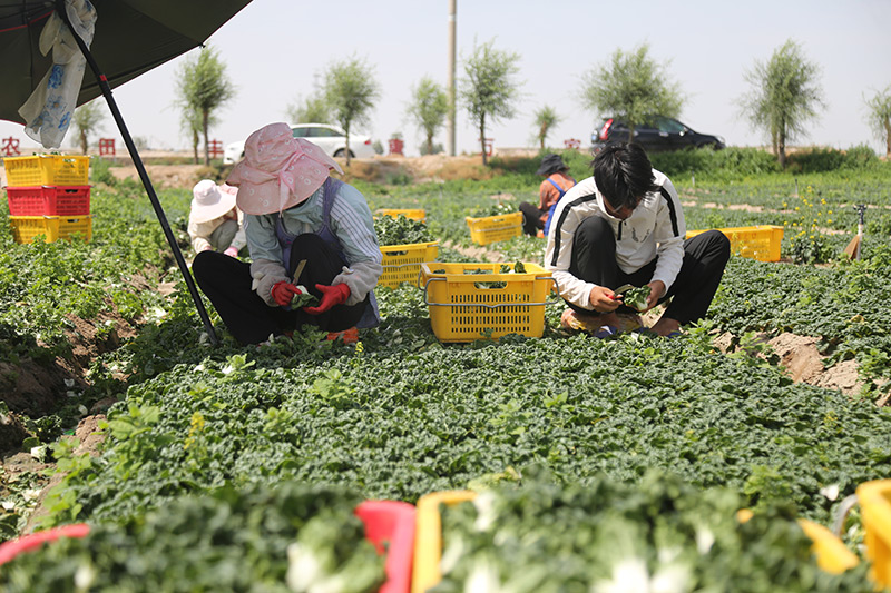 金秋时节,在武威市民勤县苏武现代农业产业园内,万亩菜田如翠绿绒毯般铺展在大漠边缘。产业园里,上百名工人正忙着采收鲜嫩的青仔与学斗(青菜)。一天后,这批带着沙乡清新气息的蔬菜,将跨越千里,端上粤港澳大湾区的餐桌。从昔日风沙肆虐的荒滩,到如今供港蔬菜的核心产地,民勤县正以“科技赋能、生态优先”为路径,将资源劣势转化为富民强县的产业优势。