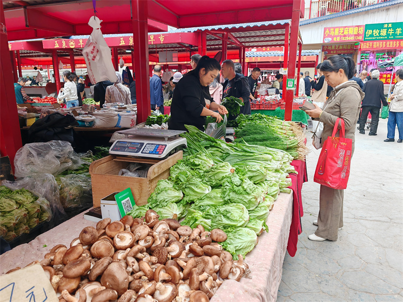 清晨的五泉早市内热闹非凡,数百个摊位售卖着蔬菜、瓜果、牛羊肉、熟食、糕点等多种产品,摊主们的吆喝声、顾客们的询价声、电子支付的到账声此起彼伏。