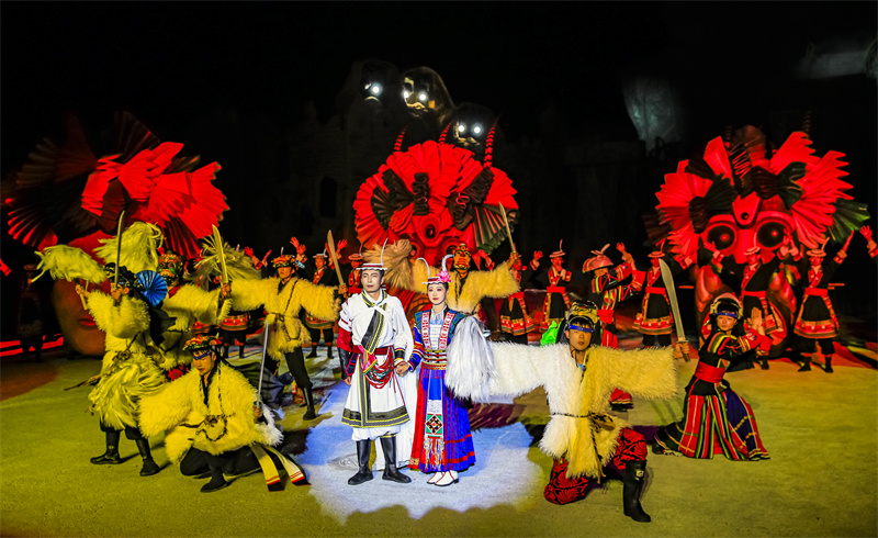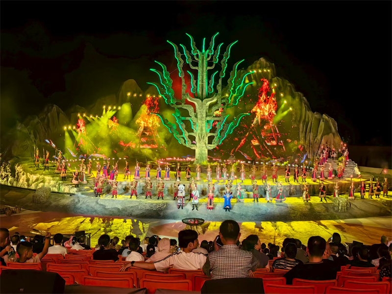 最近,文县将“池哥昼”“火圈舞”等非遗元素巧妙地融入新编实景音乐剧《白马盛典》中。该剧白马人敬仰的英雄阿尼嘎萨为主角,这位由青蛙化身的白马青年,源自史前氐族部落传承的蛙神崇拜。全剧以阿尼嘎萨的传奇人生为主线,生动演绎了他从青蛙幻化为勇士,挺身而出抵御黑灵灾祸、拯救族人于危难的英雄故事。当夜幕降临,群山渐隐于苍茫夜色之中,《白马盛典》以巍峨山河为幕布,以璀璨星空为背景,在翠山环绕的河谷间徐徐拉开帷幕。借助“声光电”融合的多层次环形舞台等现代科技手段,远古白马人的恩怨情仇、喜怒哀乐被一一呈现,宛如一幅幅鲜活的古老画卷在天地间铺展。山河作幕,让演出舞台更显辽阔恢宏;星空为景,使剧情蕴含了天人合一的深邃意境。坐在360度旋转座位上的观众,随着座椅转动“移步换景”,在曲折跌宕的剧情牵引下深度共情,渐渐沉浸于这场鲜活的民族文化盛典之中,任由思绪驰骋,仿佛随着歌声与故事一同坠入白马河的神秘梦境。