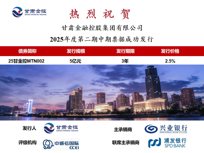 2025年10月17日,甘肃金融控股集团有限公司成功发行2025年度第二期中期票据。本期票据发行规模5亿元,期限3年,由兴业银行牵头主承销,浦发银行联席承销,吸引了多家商业银行、信托公司等机构投资者踊跃认购,市场反响热烈。