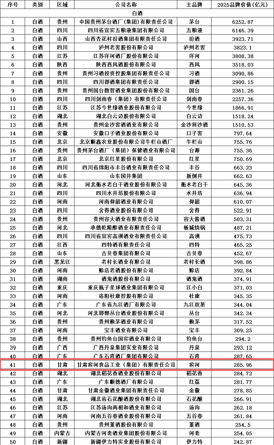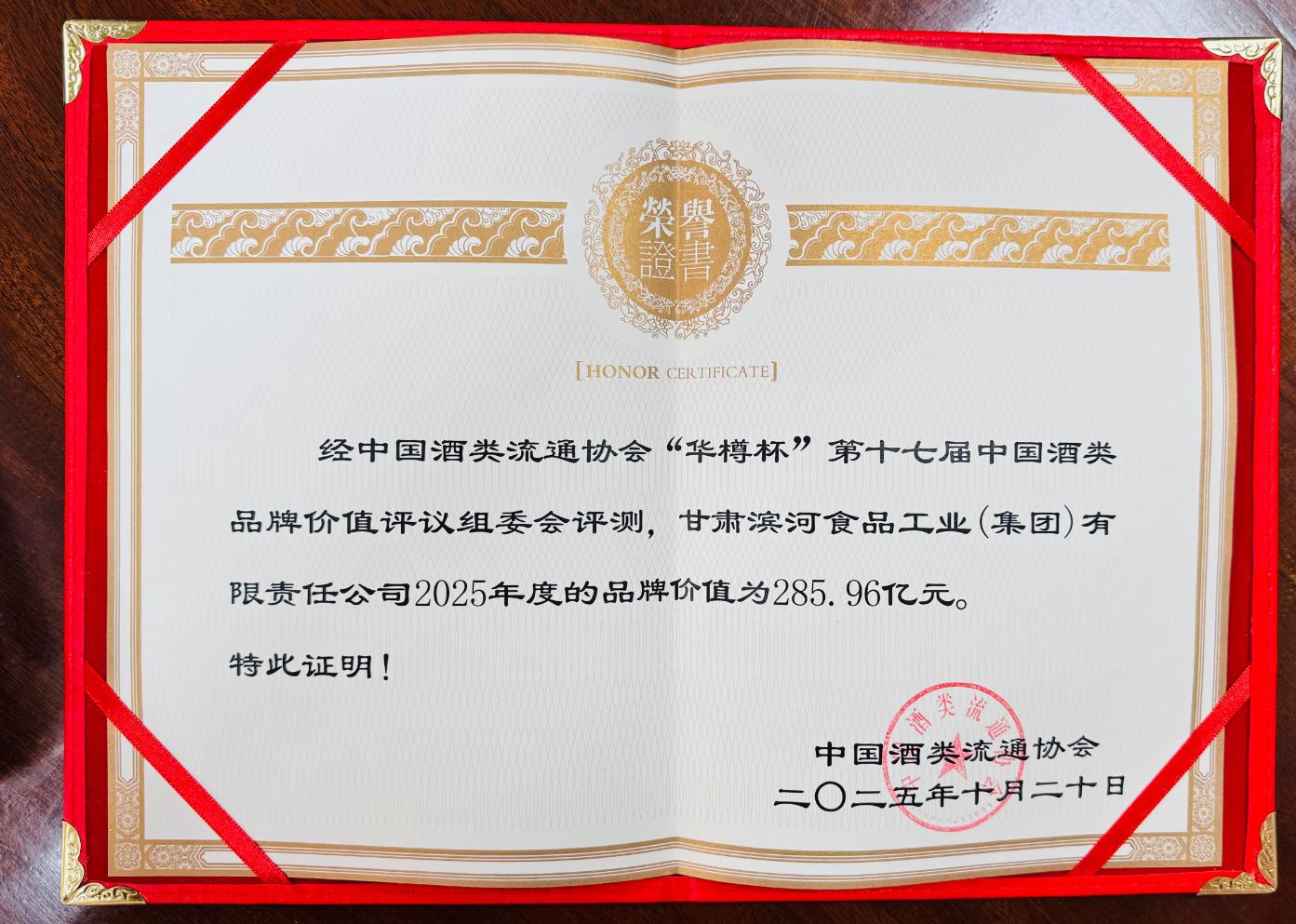 滨河集团2025年度品牌价值为285.96亿元。作为酒类最高品牌价值榜单,滨河集团已连续8年荣获甘肃白酒品牌价值第一名。