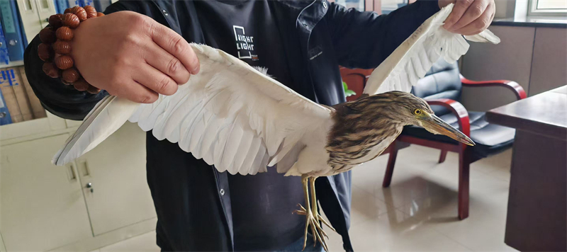经工作人员仔细检查伤势,并结合其外形特征,初步判定该鸟为国家“三有”(有重要生态、科学、社会价值)保护动物——池鹭。池鹭因碰撞导致翅膀轻微骨裂,暂无生命危险。