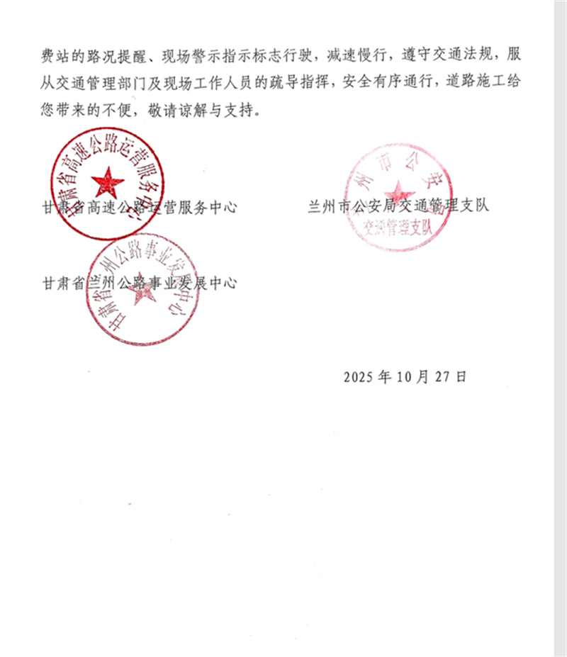 请途经施工路段的车辆及时关注交通管理部门发布的路况信息、各收费站的路况提醒、现场警示指示标志行驶,减速慢行,遵守交通法规,服从交通管理部门及现场工作人员的疏导指挥,安全有序通行,道路施工给您带来的不便,敬请谅解与支持。