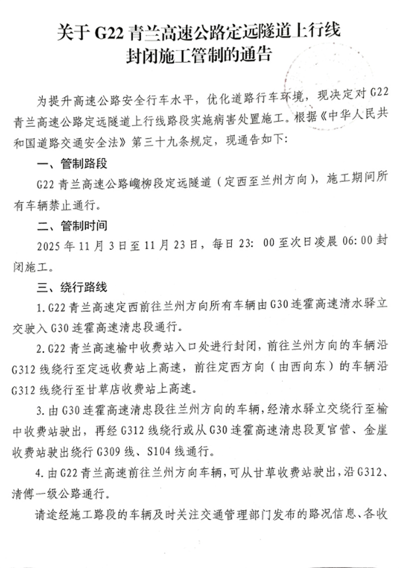 一、管制路段 G22青兰高速公路巉柳段定远隧道(定西至兰州方向),施工期间所有车辆禁止通行。