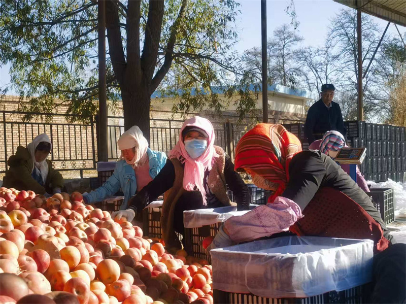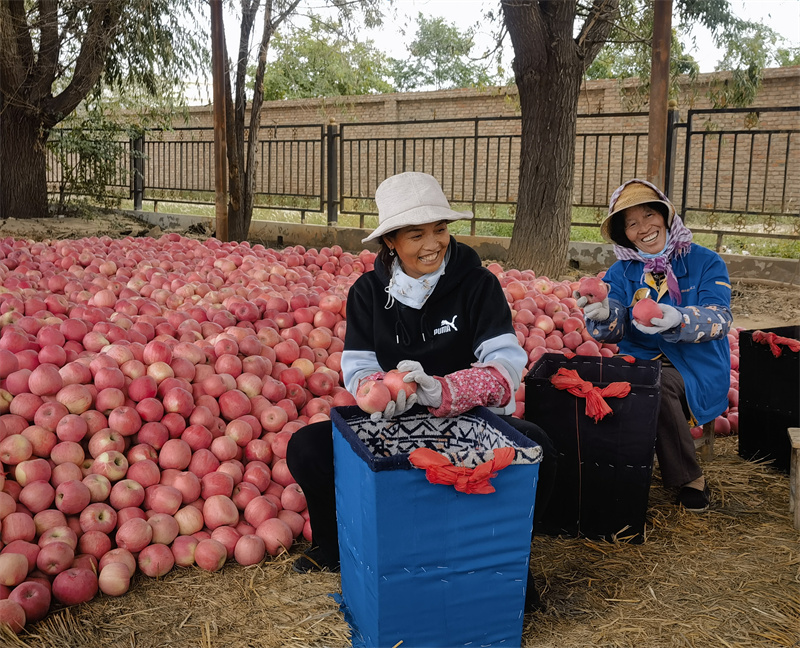 来到窎沟村农贸交易市场,农户车上一筐筐红彤彤的苹果,经过挑选、测量、装箱等工序后,源源不断运往全国各地。“今年,我家的苹果又丰收了,预计收入4万元左右,明年我计划再扩大种植规模。”作为当地瓜果种植能手,窎沟村农民贝兴梅借着政府主导产业的东风,从刚开始的2.2亩发展到现在的10亩,日子越过越红火。苹果种植产业不仅富了种植户,更带动了周边农户“农闲增收”。每到采摘季,闲置劳动力便前来帮果商分拣苹果,一天能挣130元。魏堂娟是受益者之一,她说:“现在是农闲时间,赶上收苹果,既能带孩子又能挣钱,挺好的。”