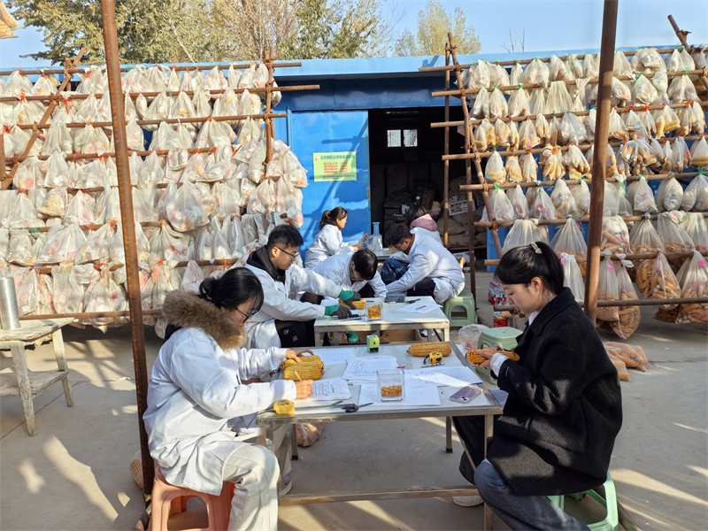走进张掖玉米科技小院,支架上悬挂的一袋袋玉米种子承载着育种创新的希望,甘肃农业大学和河西学院的学生们正专注开展考种工作,测量、记录、分析每一个关乎品种改良方向的数据。