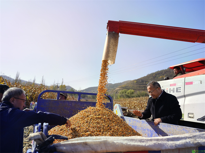 10月30日,在静宁县界石铺镇大河村的旱作梯田玉米大面积单产提升试验示范基地,两台收割机正穿梭于玉米秆叶之间。伴随着“咔嚓”作响的收割声,饱满的果穗被迅速卷入机身,金黄籽粒顺着输送臂倾泻而出,在运输车车斗中堆起层层细密的“金色波浪”。这些刚刚离田的玉米,即将被送往京首福种子站,开启一段“新鲜直达”的烘干旅程。