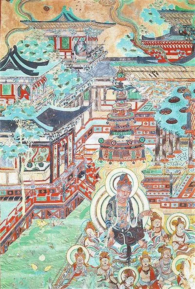 净土变是这一时期壁画中最流行、最多的壁画。莫高窟唐代壁画中有200余幅净土变,包括西方净土变、弥勒净土变和药师净土变。其中最流行的是西方净土变(又叫观无量寿经变),它是根据《观无量寿经》的内容,绘制西方极乐世界阿弥陀佛讲经极其优美的环境。《观无量寿经》中说阿弥陀佛“光明无量,照十方国,无所障碍”“彼佛寿命,及其人民,无量无边阿僧祇劫”“众生闻者,应当发愿,愿生彼国……得与如是诸上善人,俱会一处。”这里的壁画正是此类经文的反映。