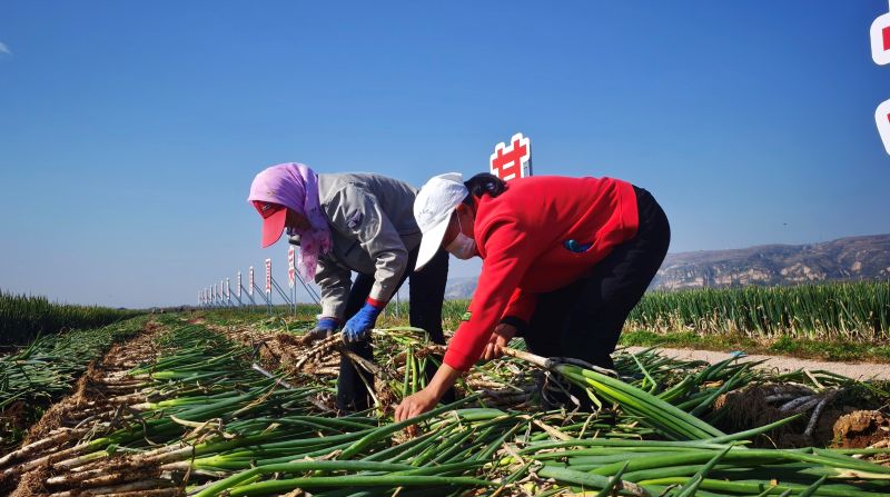 采收完成后,新鲜的大葱被迅速运往泾河川万亩现代农业产业园蔬菜分拣中心。在分拣中心,记者看到,工人们正在忙碌,经过吹皮去叶、切割包装等一系列标准化处理流程,一捆捆洁净的大葱完成了从采摘、分拣到储运全链条作业。