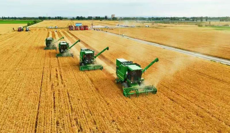 高台县宣化镇乐二村高标准农田小麦收获现场(张掖市农业农村局供图)