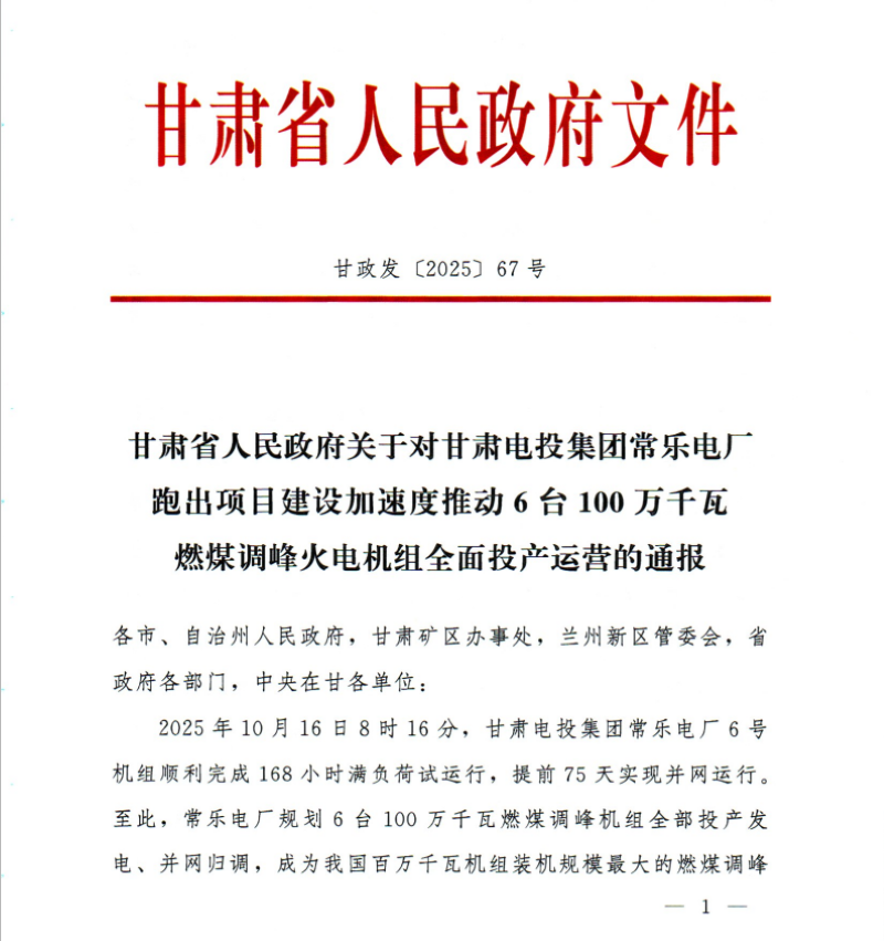 甘肃经济日报兰州讯(新甘肃·甘肃经济日报记者 李明娟)近日,甘肃省人民政府印发专题通报,对甘肃电投集团常乐电厂在项目建设中奋力跑出项目建设加速度,推进项目早建成、早投产、早运营,创造的“甘肃速度”品牌在全省给予通报表扬。