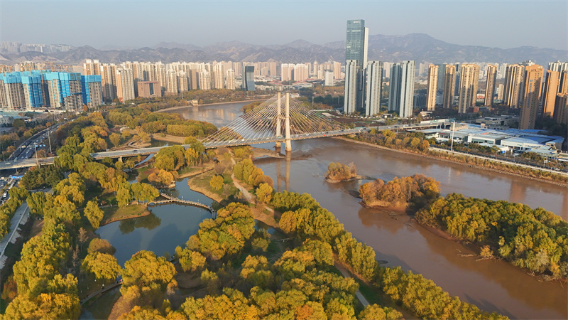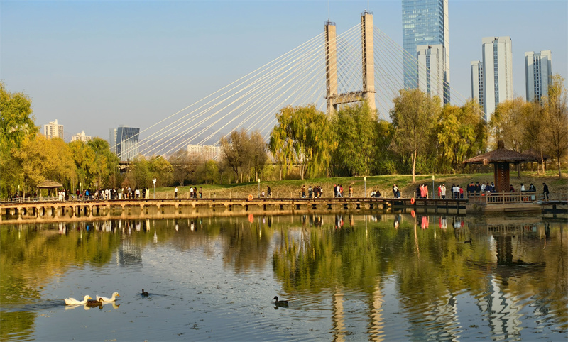11月16日,市民在兰州银滩湿地公园赏景游玩。初冬时节,兰州银滩湿地公园层林尽染、景色如画,成为市民健身漫步的好去处。