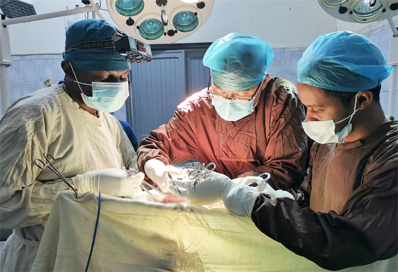“授人以鱼不如授人以渔。”强尧生深知,唯有提升当地医护人员专业水平,才能从根本上改善当地医疗状况。为此,他长期组织教学查房、病例讨论、手术带教等培训活动,将围手术期处理、腔镜手术技巧、快速康复外科等先进理念与实践技能倾囊相授,注重理论与实操结合,帮助当地医生真正掌握诊疗核心能力。此外,他还组织队员开展多场义诊,送医送药上门,为贫困患者提供免费医疗服务。2024年12月,医疗队在安达拉哈的义诊被当地电视台重点报道,既让民众感受到中国医生的温暖,也让旅居于此的华侨华人倍感自豪。