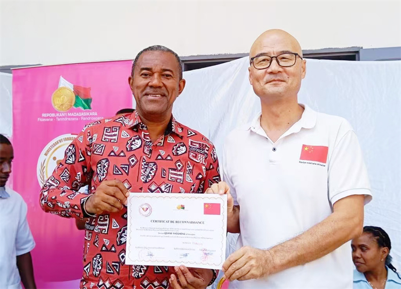 2025年5月19日,马达加斯加萨瓦大区公共卫生局举行荣誉表彰大会,强尧生凭借突出贡献荣获“萨瓦大区杰出贡献奖”,由该区区长亲自颁发嘉许状。面对荣誉,他坦言:“这份荣誉离不开中马医护人员的通力合作,每一次诊疗与抢救都凝聚着彼此的信任与善意。这份荣誉属于全体中马医疗工作者,是两国友谊的见证。”