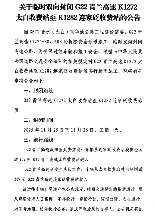 因G671合水(太白)至华池公路工程建设需要,G22青兰高速K1274+887.608处拆除安全通道施工,临时双向封闭高速公路,为确保过往车辆和施工安全,根据《中华人民共和国道路交通安全法》的相关规定对G22青兰高速K1272太白收费站至K1282连家砭收费站段实行封闭施工,现将有关事项公告如下: