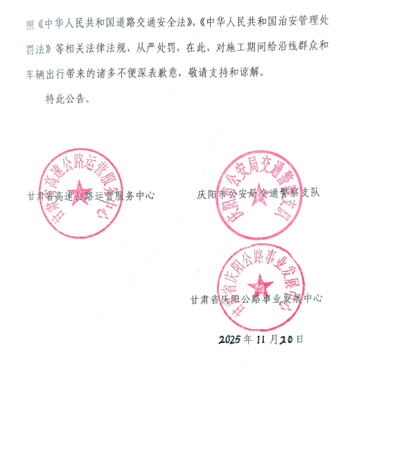 请过往车辆自觉遵守本公告规定,按照交通标志的指示通行、服从现场管理人员指挥,不得抢行、穿插行驶,谨慎驾驶、安全通行,对不听劝阻、妨碍执行公务,造成严重后果的当事人,公安机关将依照《中华人民共和国道路交通安全法》《中华人民共和国治安管理处罚法》等相关法律法规,从严处罚,在此,对施工期间给沿线群众和车辆出行带来的诸多不便深表歉意,敬请支持和谅解。