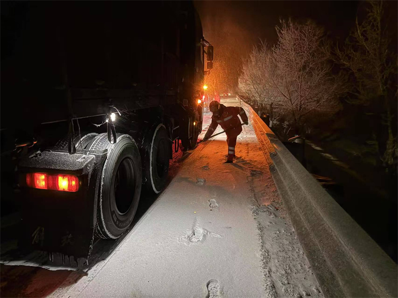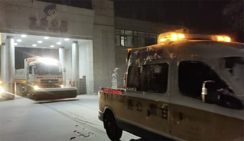 降雪伊始,该中心立即启动除雪防滑应急预案,应急队伍、机械设备第一时间奔赴一线。按照“先主后次、点线结合”原则,作业人员以机械除雪为主、人工清雪为辅,对连续下坡、急弯陡坡、桥隧进出口等重点区域进行精准作业。除雪车、融雪剂撒布车交替作业,车灯划破夜色,铲雪板推雪前行,融雪剂均匀铺撒,有效遏制路面结冰;养护人员顶风冒雪,加密巡查频次,实时监测路面状态,及时补撒防滑料与融雪剂,引导过往车辆安全通行。同时,该中心认真履行监管职责,督促辖区内高速公路运营单位同步开展除雪保畅作业,凝聚齐抓共管合力,共同守护人民群众的平安归途。