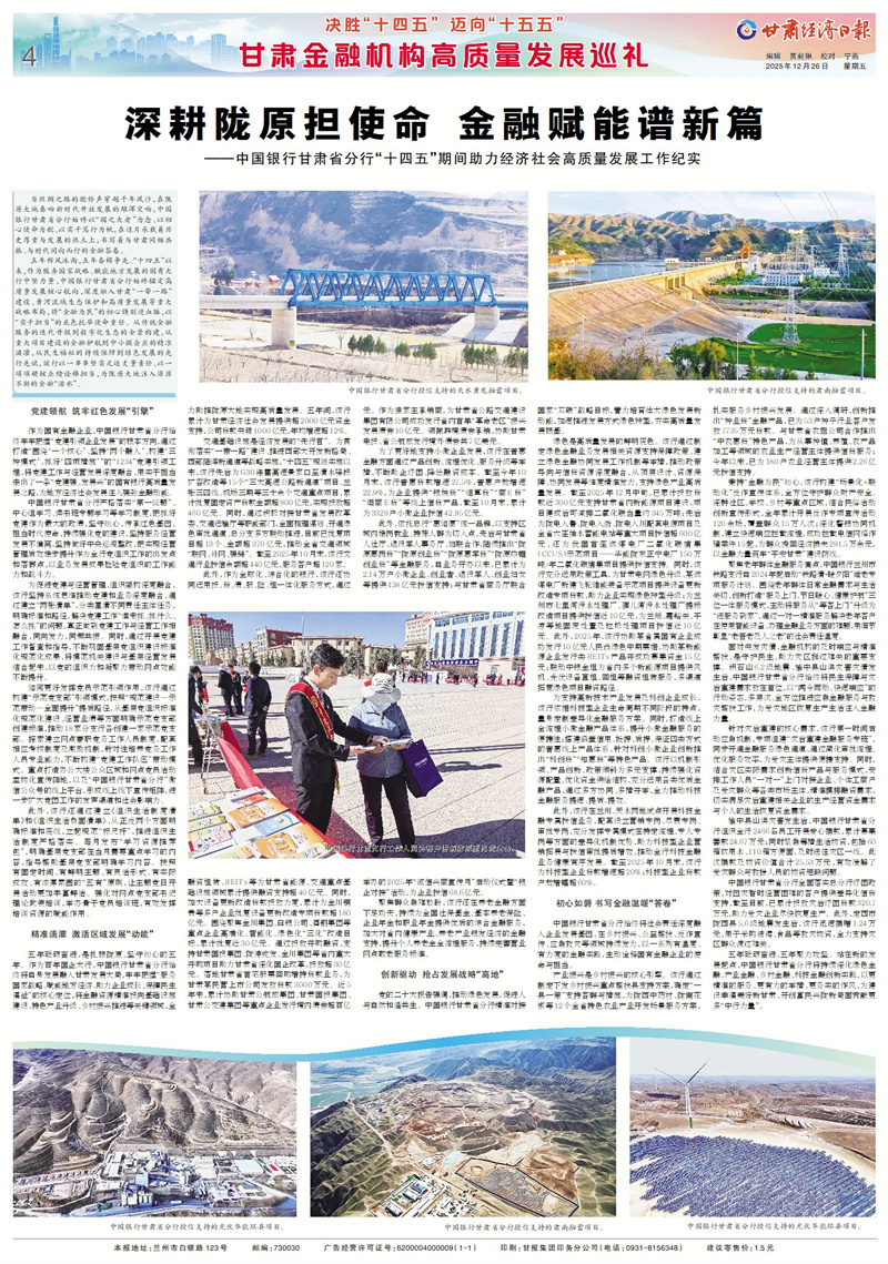 五年栉风沐雨,五年奋楫争先。“十四五”以来,作为服务国家战略、赋能地方发展的国有大行中坚力量,中国银行甘肃省分行始终锚定高质量发展核心航向,深度融入甘肃“一带一路”建设、黄河流域生态保护和高质量发展等重大战略布局,将“金融为民”的初心镌刻进血脉,以“实干担当”的底色托举使命重任。从传统金融服务的迭代升级到数字化生态的全景构建,从重大项目建设的金融护航到中小微企业的精准滴灌,从民生福祉的持续保障到绿色发展的先行先试,该行以一串串坚实足迹丈量责任、以一项项硬核业绩诠释担当,为陇原大地注入源源不断的金融“活水”。