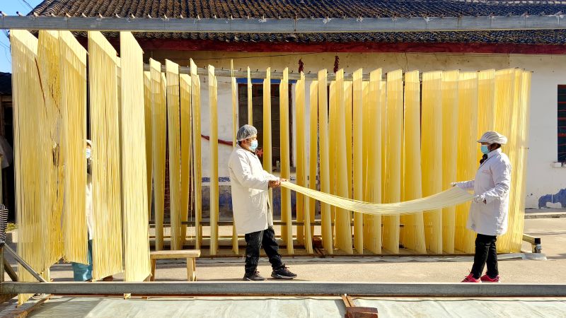 工人正在晾晒挂面。