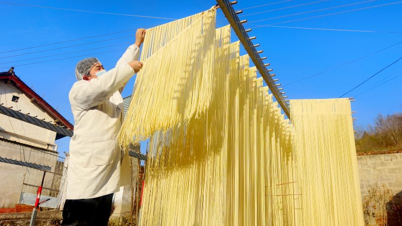 随着口碑不断传播,他家的挂面成了当地响当当的农家品牌。因为是纯手工制作,制作时间长,产量上不去,为了满足乡亲们的需求,郭师傅着手办起了合作社,带领大家把手工挂面产能扩大。眼下,正是挂面生意最兴隆的时候。
