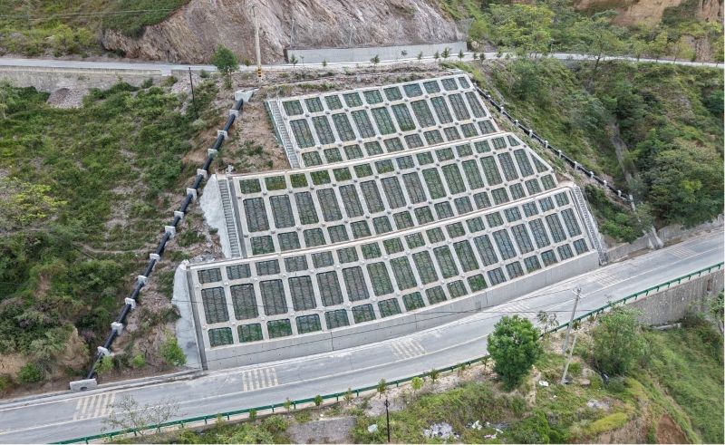 在灾害防治与项目建设中,技术创新成为破题关键。针对国道212线部分路段上边坡山体破碎风化、易滑塌的隐患,该段采用“内挡墙+锚索框格梁”防护方案,稳固路基边坡;面对尚德镇横丹电站库区路段路基垮塌、旧挡墙基础掏空的难题,创新引入钢花管微型桩加固技术,新建的钢花管微型桩挡墙桩体插入河床4米、深入挡墙2米,对旧墙利用段采用19米长双排钢花管微型桩贯穿挡墙打入河床,既消除了灾害隐患,又筑牢了路基防洪抗冲防线。