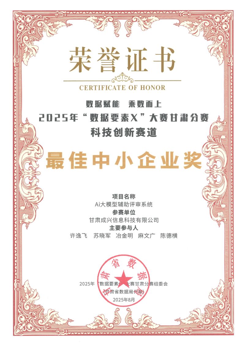 成兴公司始终坚持“科技是第一生产力,创新是核心竞争力”的理念,自主研发的AI大模型辅助评审系统成为年度标志性创新成果,已成功部署应用于甘肃智慧阳光采购平台、中油兰州石化采购平台、金川集团采购平台等多个重要场景。该系统作为省招标集团数字化创新的核心成果之一,凭借高效、精准、智能的核心优势获得行业权威高度认可,不仅入选《“智联招采 引领未来”人工智能技术+招标采购创新应用蓝皮书》,还被编入中国土木工程学会工程招标代理分会“创新实践案例”,并在甘肃省数据局“数据要素X”大赛中斩获“最佳中小企业奖”,用实力彰显了省招标集团培育子公司创新能力的显著成效,也提升了省招标集团在智能招采领域的行业话语权。
