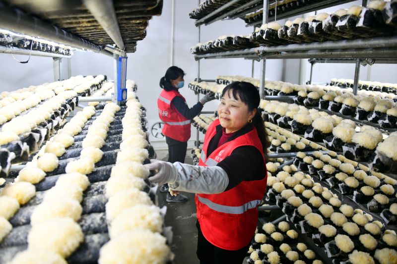 兰州新区秦东农业投资发展有限公司银耳基地,工作人员在采摘银耳。