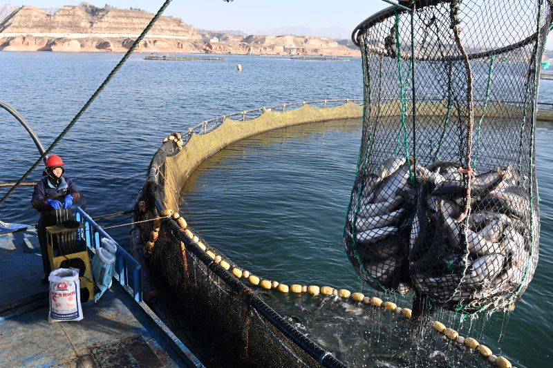 永靖县刘家峡虹鳟鱼养殖基地,工作人员在捕捞虹鳟鱼。