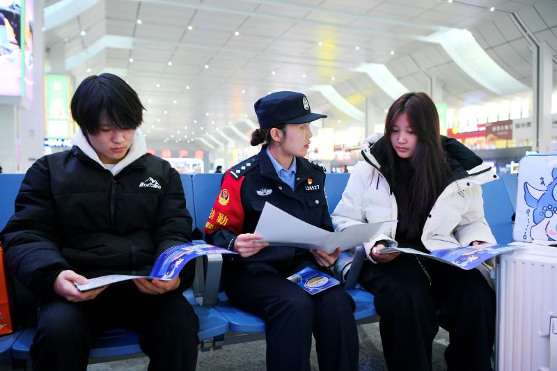 1月22日,民警在兰州西站为返乡学生讲解防诈骗、防盗窃等安全知识。随着2026年寒假开启,甘肃省各大火车站迎来大学生集中返乡客流,兰州铁路公安局兰州公安处组织开展“流动式”安全宣讲活动,切实提升大学生安全防范意识和自我保护能力,为学子平安返乡送上暖心的“安全礼包”。 新甘肃·甘肃经济日报记者 瞿娟 摄