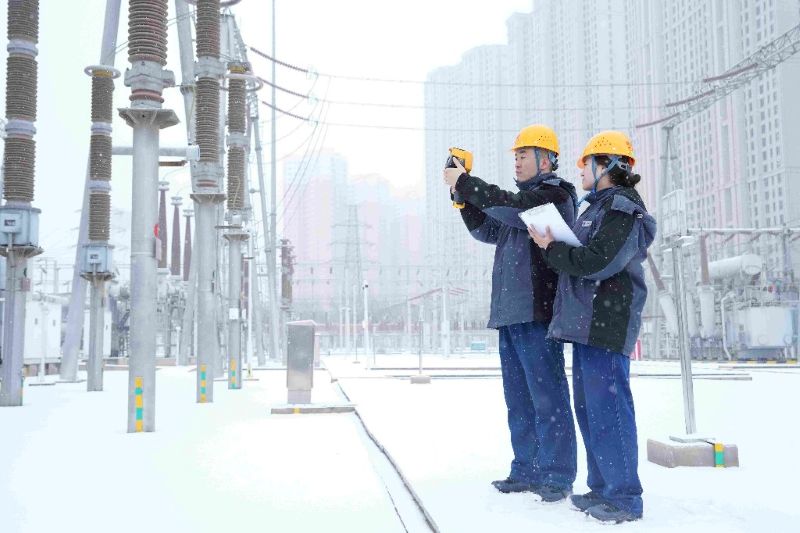 国网兰州供电公司变电运维中心员工在330千伏桃树村变电站进行雪天特巡。 李柳雅 摄