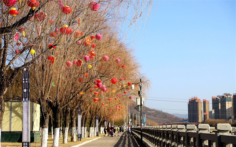 轩辕湖主干道两旁的灯杆上,整齐悬挂的大红灯笼一字排开,与来往车辆、行人构成一幅鲜活的民生图景。充国广场作为市民休闲聚集的核心区域,节庆布置独具特色。广场路旁的树木上,除了各式红灯笼,还点缀着中国结、祥云挂件、彩色灯串等饰品,造型别致、寓意美好,引得路人频频驻足。
