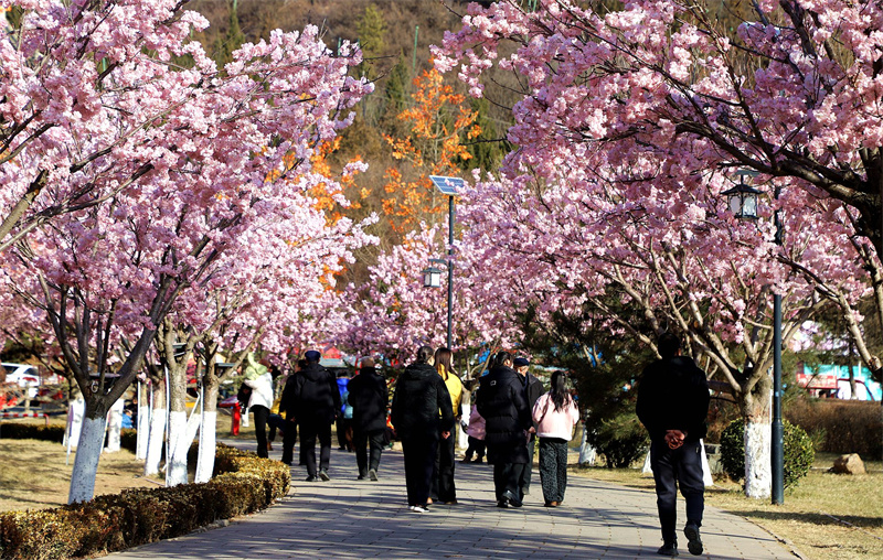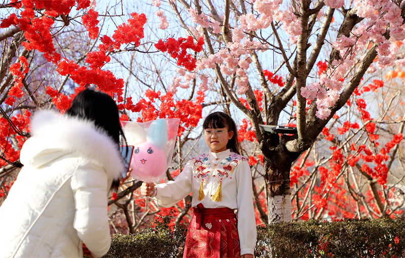 晴好天气里,不少市民结伴而来,或在花树灯影下定格笑脸,或沿着湖畔漫步赏景。孩子们在步道上追逐嬉戏,清脆的欢声笑语萦绕湖畔,为这份新春热闹更添几分生机。“今年的新春布置比往年早了不少,娇艳的桃花装饰搭配红彤彤的柿子灯笼,造型精致又喜庆,氛围感直接拉满,感觉过年的脚步一下子就近了。”市民王玉玲笑着说。
