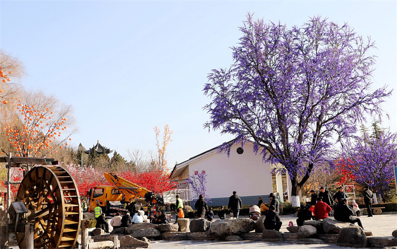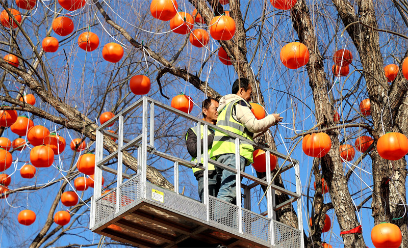 走进轩辕湖公园,冬日的静谧被节庆布置彻底唤醒。沿湖树木间,粉色桃花与艳红梅影错落绽放,金黄的柿子造型挂件与红彤彤的灯笼相映成趣。串串灯笼垂挂枝头,随风轻晃,光影流转间,满溢着吉祥如意的美好寓意。