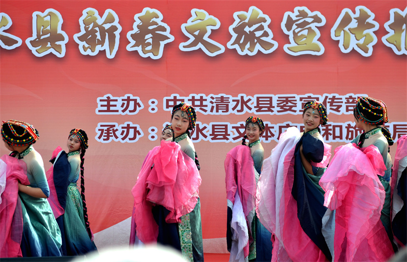 在惠民举措发布环节,清水县推出一系列诚意十足的消费福利:温泉泳票买一送一、天水古城至清水新春旅游专线免费通行、餐饮住宿叠加优惠、千张惠民消费优惠卡发放;长达54天的优惠周期,让广大游客切实享受到新春文旅红利。活动现场,文艺展演精彩纷呈,舞蹈《格桑花开》《春述》、街舞《律动春天》等节目轮番上演,节奏明快、形式多样,将现场氛围不断推向高潮,充分展现清水的民俗风情与朝气活力。