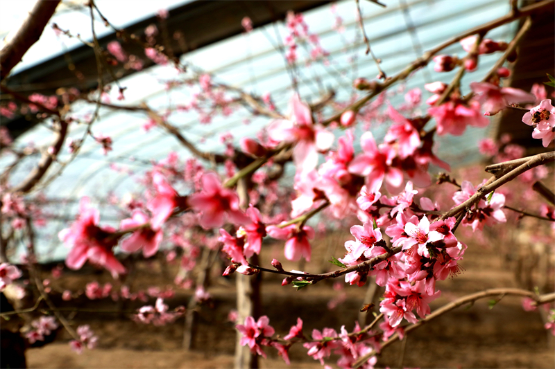 “示范园运用错期升温技术,自1月10日起,桃花、杏花、樱桃花陆续绽放。目前桃花、杏花已进入盛花期,长达一个多月的花期将持续吸引游客前来参观品鉴。”示范园副场长王勤太介绍,园区种植的桃、李、杏、大樱桃等果蔬,全部采用绿色有机种植模式,施用农家肥并依托蜜蜂自然授粉,既保障了果品的优良品质,也让花期景观更具观赏价值。
