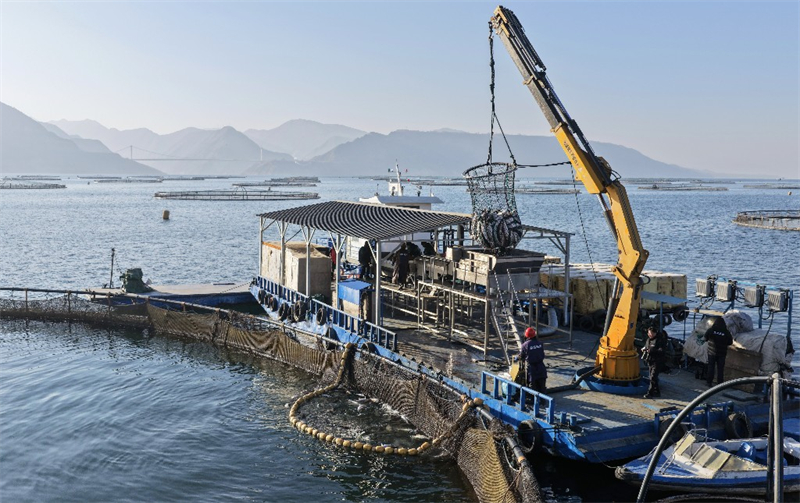 近日,永靖县刘家峡文祥渔业养殖场内,工作人员正忙着捕捞虹鳟鱼。眼下,刘家峡水库的虹鳟鱼迎来集中捕捞上市期,该养殖场养殖规模达3000余吨,年产值超1.5亿元。新甘肃·甘肃经济日报记者 瞿娟 摄
