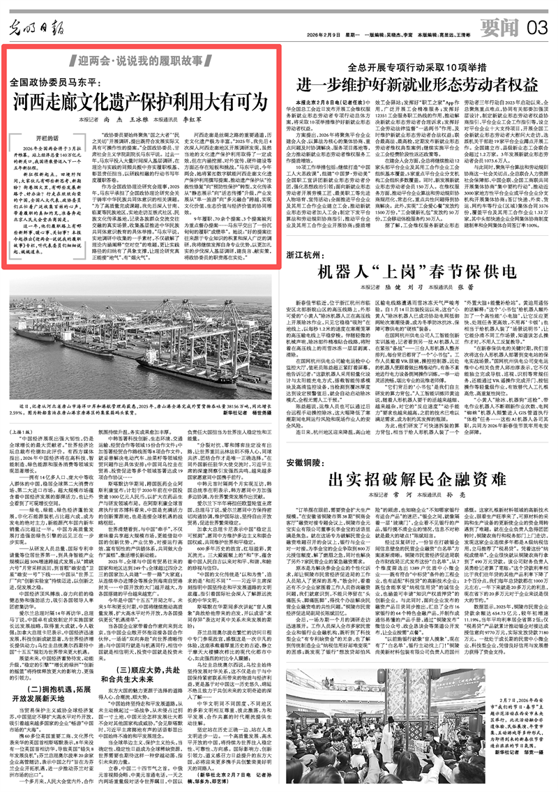 河西走廊是丝绸之路的重要通道,历史文化遗产极为丰富。“2025年,我先后4次深入河西走廊地区开展调研发现,虽然当地的文化遗产保护利用取得了一定成效,但在内涵挖掘、对外宣传、硬件建设等方面还存在短板和挑战。”马东平说,今年两会,她将紧扣数字赋能河西走廊文化遗产保护利用撰写提案,推动遗产保护从“抢救性修复”向“预防性保护”转型,文化传承从“静态展示”向“活态传播”升级,产业发展从“单一旅游”向“多元融合”跨越,实现文化价值、生态价值与经济价值的协同增效。