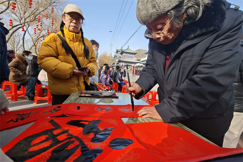 此外,本次活动特设非遗传承与年味体验区。非遗体验区汇聚糖画、微雕葫芦、剪纸等传统技艺,不少市民在传承人指导下亲手体验,感受非遗的独特魅力与创作乐趣。敦煌岩彩传承人门珊展示古法矿物颜料,黄河石画非遗代表性传承人姚立娟、皮艺非遗代表性传承人王泽荣、临砚非遗代表性传承人李江平纷纷亮相,展示各自非遗技艺精髓。他们还现场教授市民制作技巧,让传统技艺在互动中得以传承。