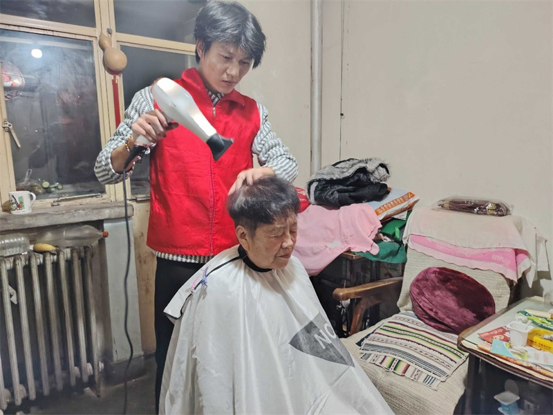 随后,志愿者又为76岁的王奶奶修剪了头发。打理完毕后,两位老人精神焕发、相视而笑,王奶奶紧紧拉着志愿者的手,不停道谢:“这下我们兄妹俩都能漂漂亮亮、干干净净迎春节了,真是太暖心了!”