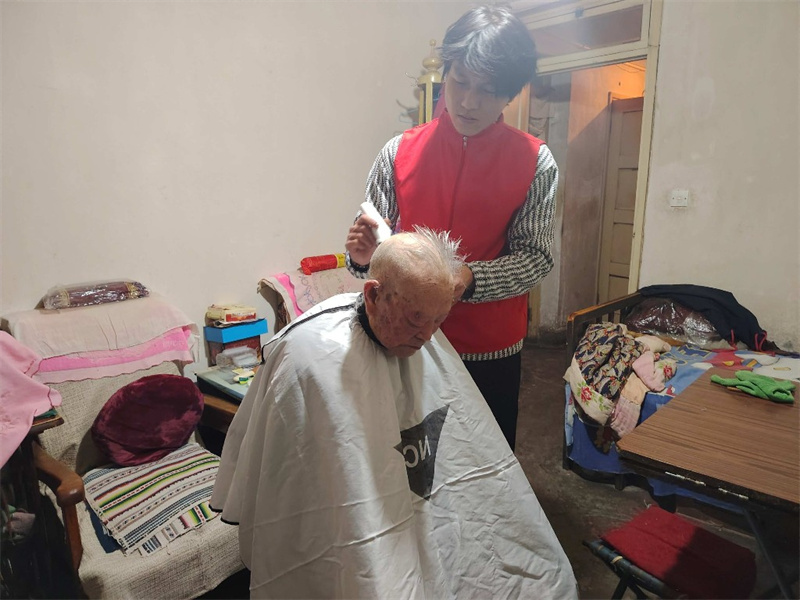 在老人家中,志愿者阿玉迅速展开围布,将剪刀、梳子、电推剪等工具仔细消毒,轻声细语地与老人沟通。因王爷爷年事已高、听力不佳,阿玉便俯下身子、凑近耳边耐心询问,温柔地说道:“爷爷,咱们把头发理了,干干净净过年,好不好?”得到老人点头应允后,理发服务正式开始。