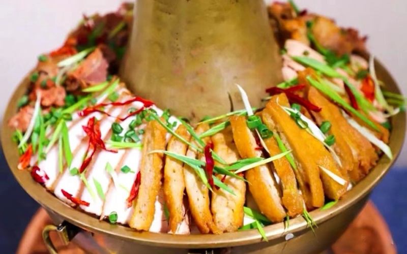武山暖锅也称“铜暖锅”或“锅子”,是介于火锅与砂锅之间一种美食。它源于当地“蔬菜之乡”的物产,常在节庆、待客时登场,象征团圆与红火。在武山,一般使用中间有烟囱的紫铜暖锅,下燃木炭,能持续加热,保温性好。