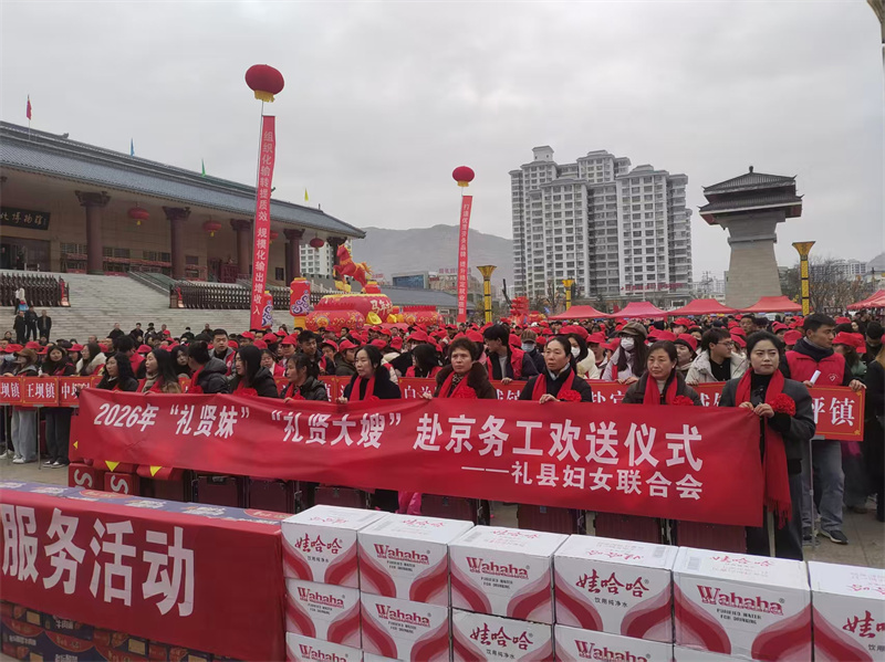 2月25日,陇南市礼县秦人广场同样暖意奔涌。210名“礼贤妹”“礼贤大嫂”整齐列队、整装待发。满载着姐妹们希望的大巴从西汉水畔出发,驶向首都北京,开启新一年的增收致富与逐梦之旅。