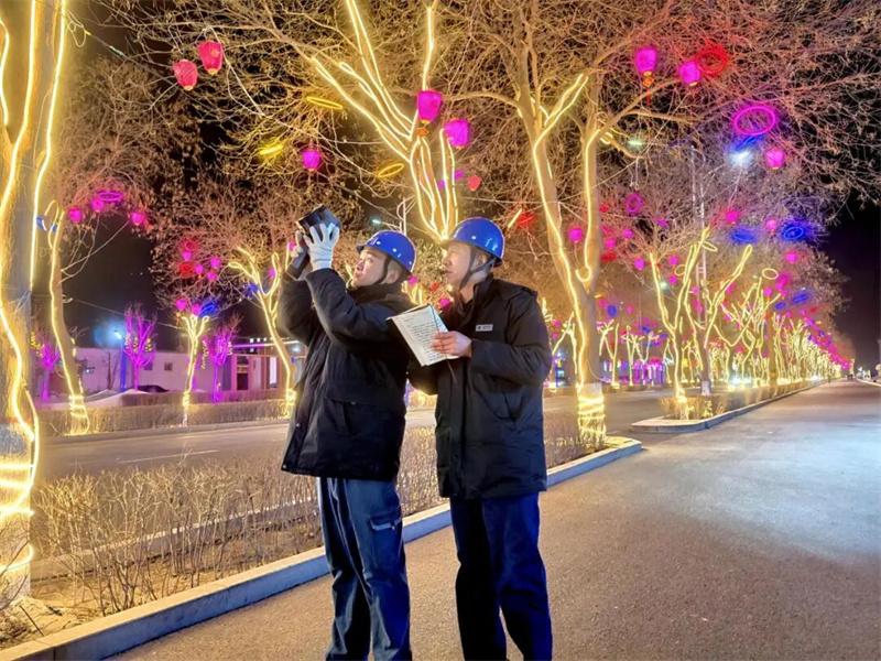 国网民勤县供电公司员工在民勤县城大街开展红外测温工作,并对春节花灯进行专项用电安全检查。 何自乐 摄