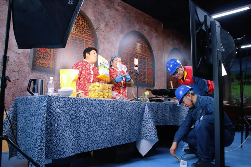 国网庆阳供电公司员工为合水县西华池镇唐旗村“唐Q大队”助农直播间开展专项用电检查,确保直播用电稳定可靠。 高靓 摄