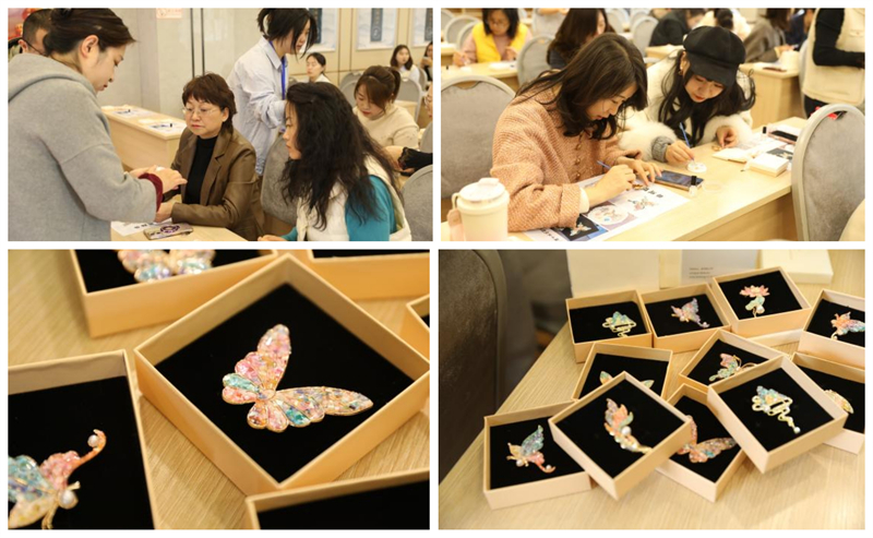 在实践环节,老师细致演示了点胶、镶嵌等关键步骤,大家纷纷化身“能工巧匠”,精心挑选贝片,或依图勾勒,或自由创作,指尖轻捻,镊子起落,一片片薄如蝉翼的螺壳被小心翼翼地镶嵌于胸针基底,打磨声、欢笑声交织在一起,现场气氛热闹非凡。随着时间的推移,一枚枚独一无二的螺钿胸针逐渐成型——有的如孔雀开屏绚烂夺目,有的似青花瓷般清雅脱俗,在光影流转间折射出女职工们细腻的巧思与审美追求。